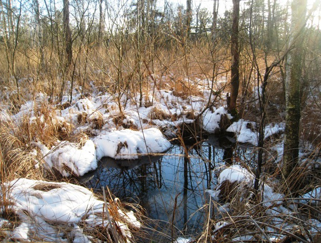 Schlamm- und Fadensegge besiedelt. An ihren Rändern wachsen Fieberklee, Scheidiges Wollgras, Blasensimse und Sumpfblutauge.